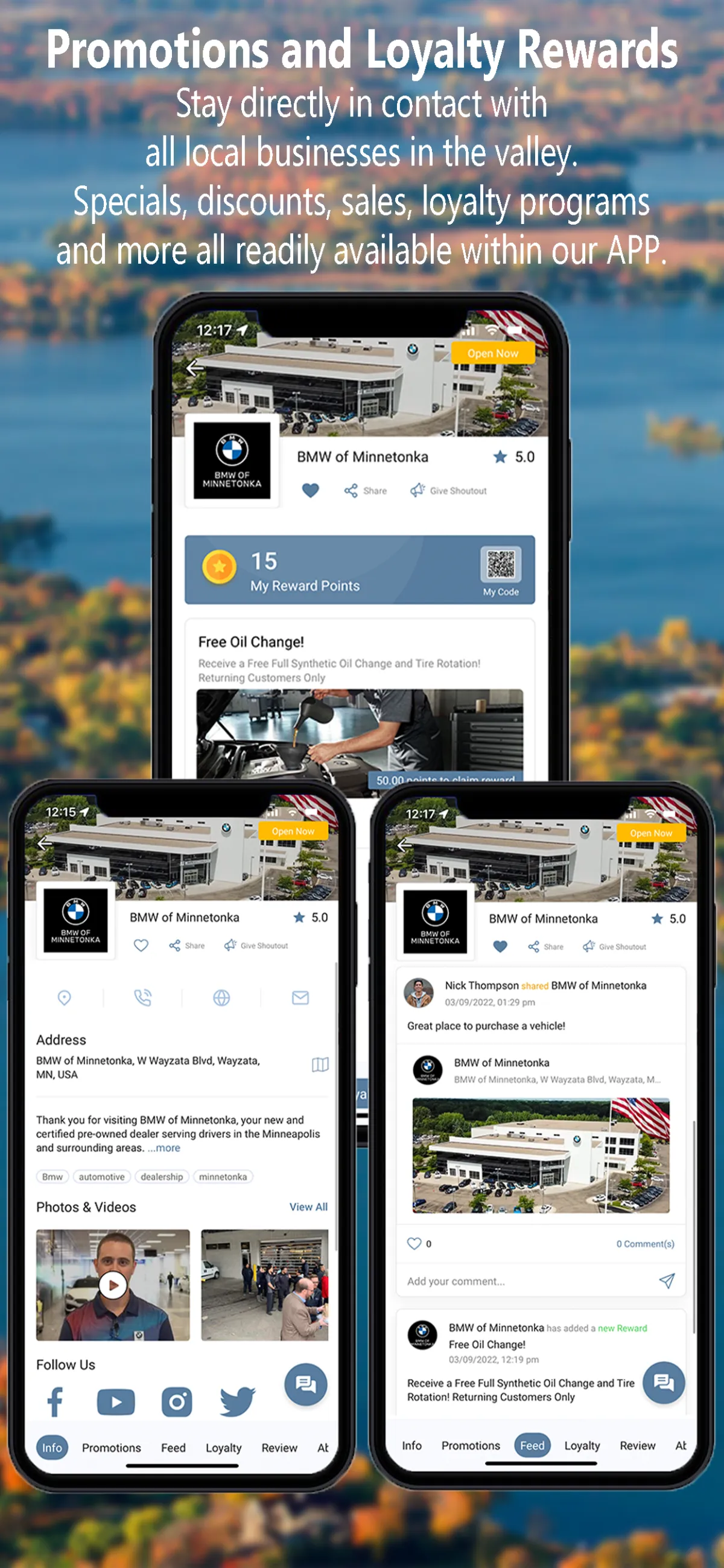 Download the app, register your profile, access promotions, leave a review, meet the owners, join loyalty programs, share it among friends and family... all within the Think Local MN mobile and web app. Let's support our communities, build our ecosystems up and fight off the bog box brands that take away from our hard working business owners.